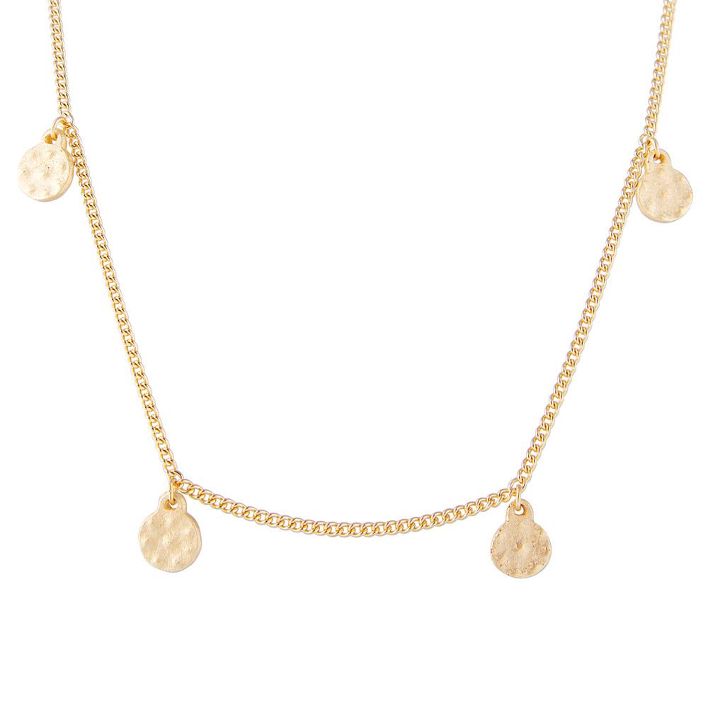 This season's charm necklace comprises circular discs with hand hammered indentations on a rolo chain. It is adjustable in length so it can be worn solo or layered with other necklaces.