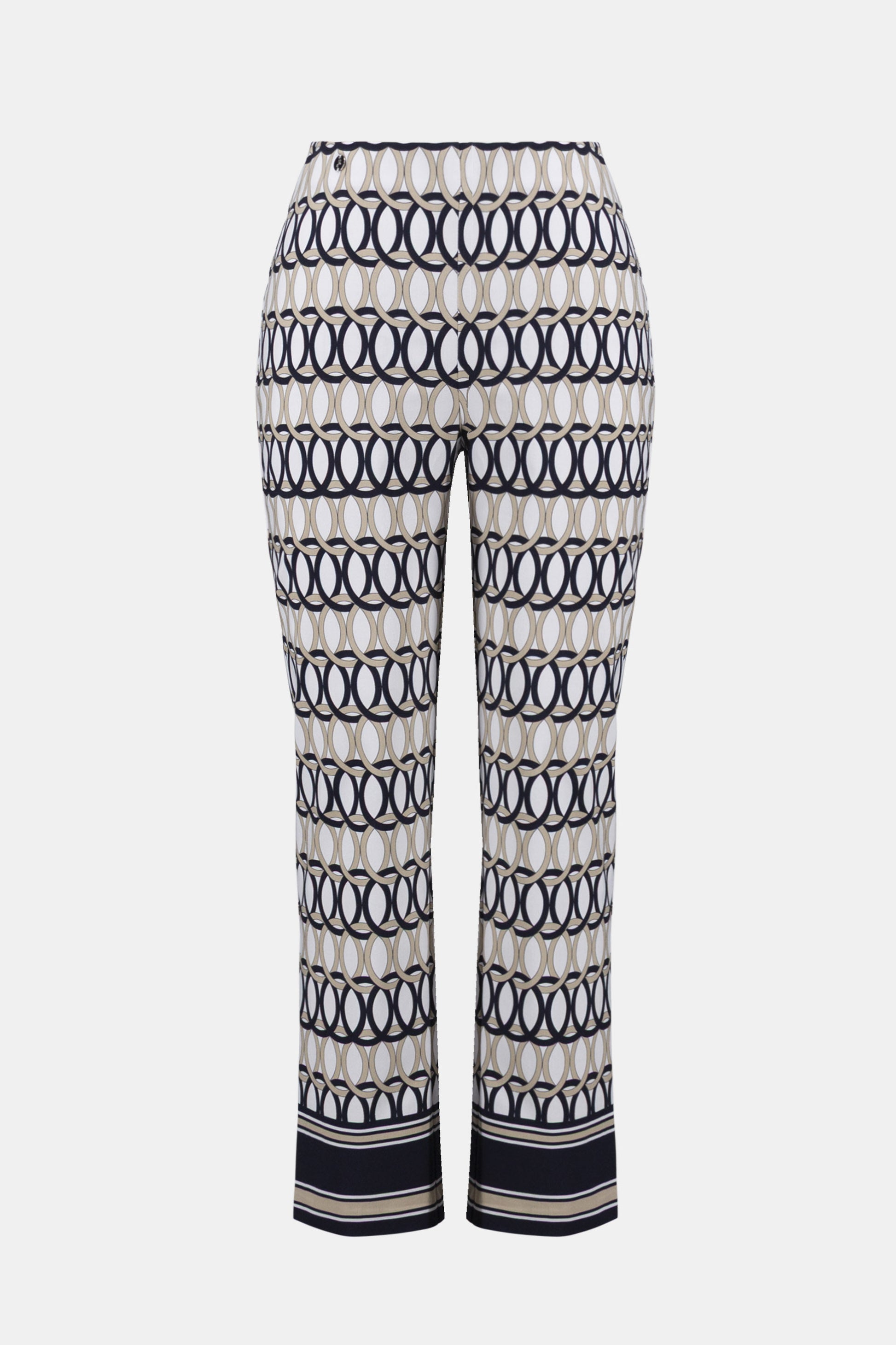 Smart and graphic, these straight-leg millennium pants feature a bold geometric dot border print, a hidden elastic waistband for smooth comfort, and a subtle JR ornament at the front waist.