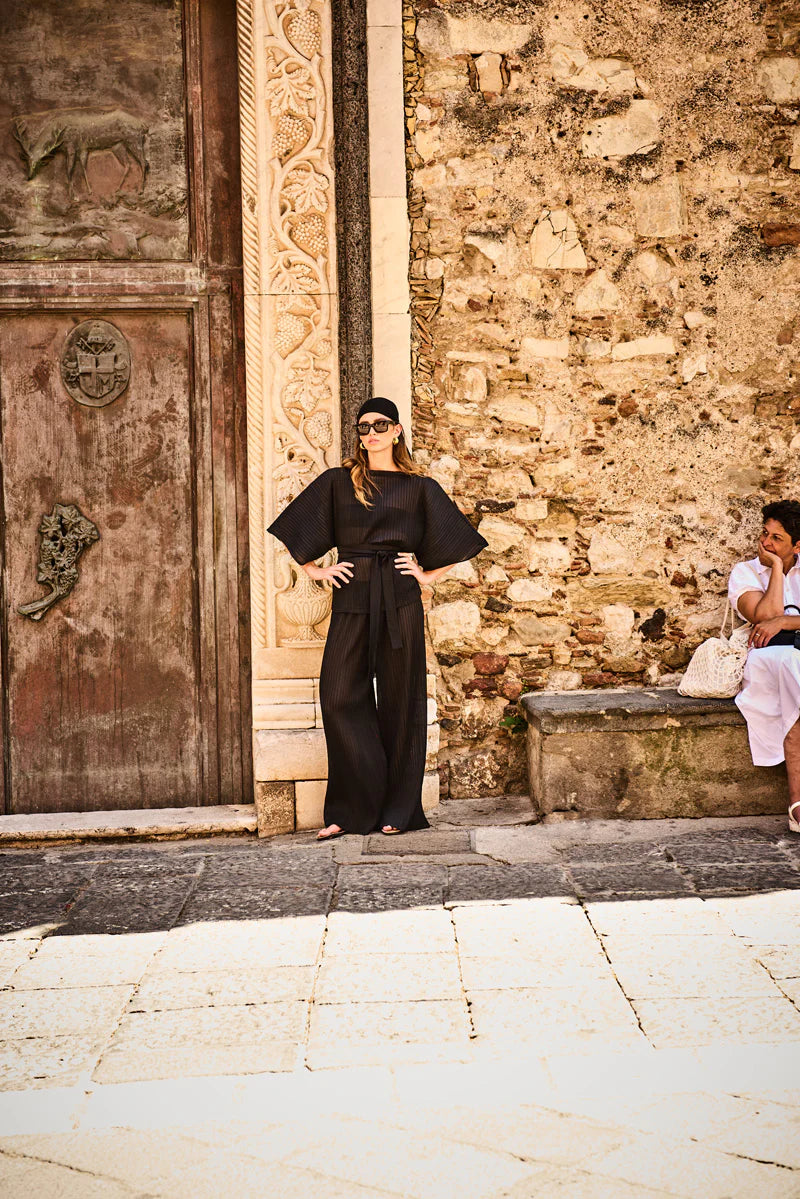 The Miso Shell is an elevated piece featuring an exaggerated sleeve and flattering boat neckline. Crafted in the Miso Pleat Chiffon, a fabrication that presents a woven pleated texture, this tricot knit offers a beautifully structured yet lightweight feel.