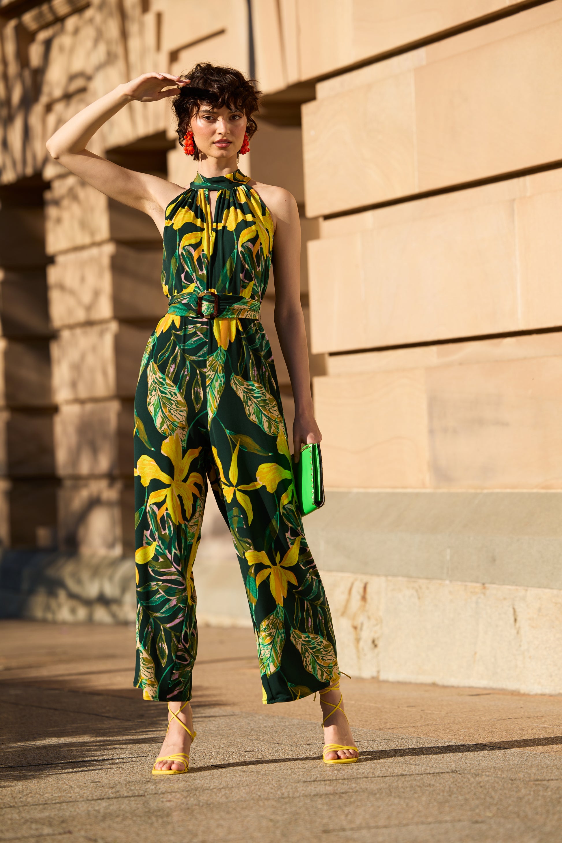 The Lemon Lagoon Jumpsuit is made from luxurious stretch jersey and showcases a vibrant exclusive SACHA DRAKE print with higher neckline and keyhole cut-out. Complete with a detachable self-tie belt, tortoise buckle for styling, and an ankle-length finish, this Australian-made piece is perfect for holidays, travel, and luncheons.